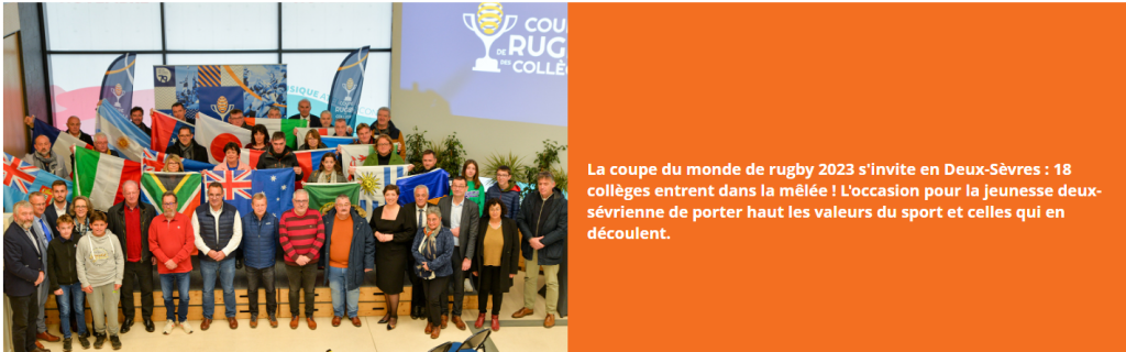 Tout au long du 1er semestre 2023, sur différents secteurs, Bressuire, Parthenay, St Maixent l’Ecole et Niort, des rassemblements des écoles (70 écoles) ont permis à environ 6 000 enfants de s’initier au rugby éducatif. D’ailleurs ceux-ci vont participer aux vendredi « Villages coupe du Monde » qui auront lieu tous les vendredis sur différents sites avec le club local pendant la Coupe du Monde de Rugby en France en Septembre/Octobre prochain.